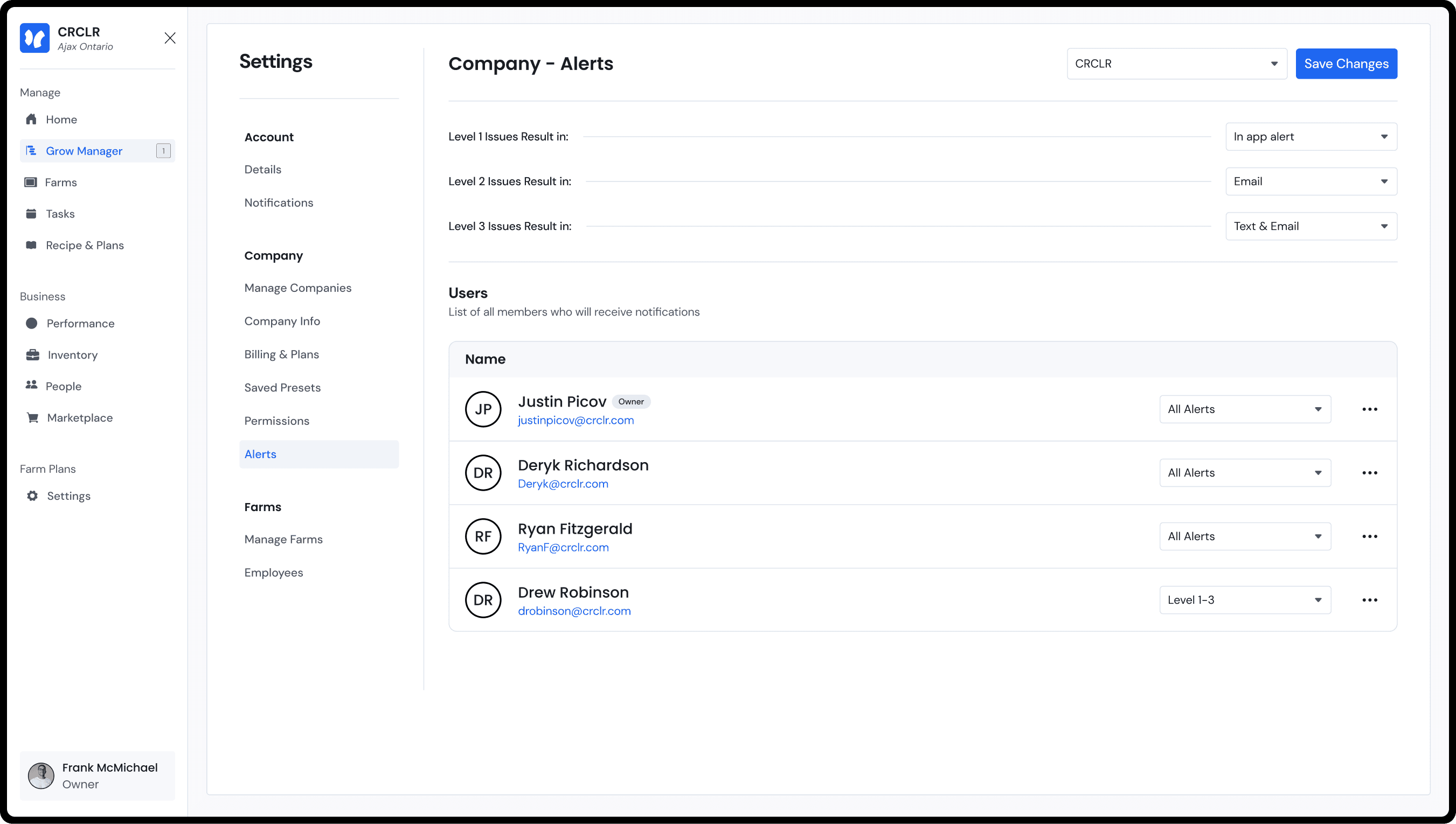 Users can manage the actionable response related to each issue level to meet their needs. The options include none, in app notifications, emails, and text messages