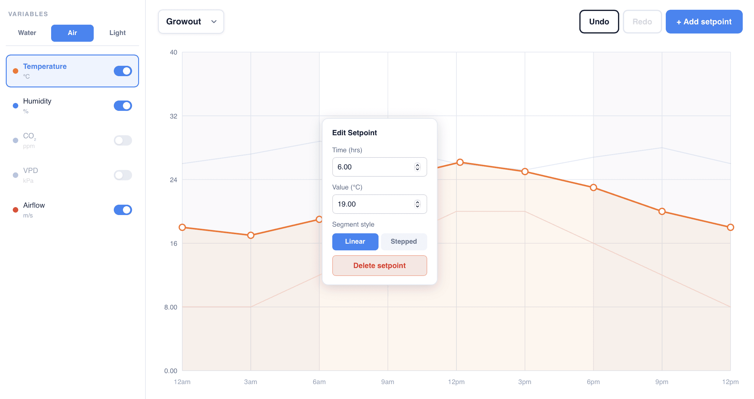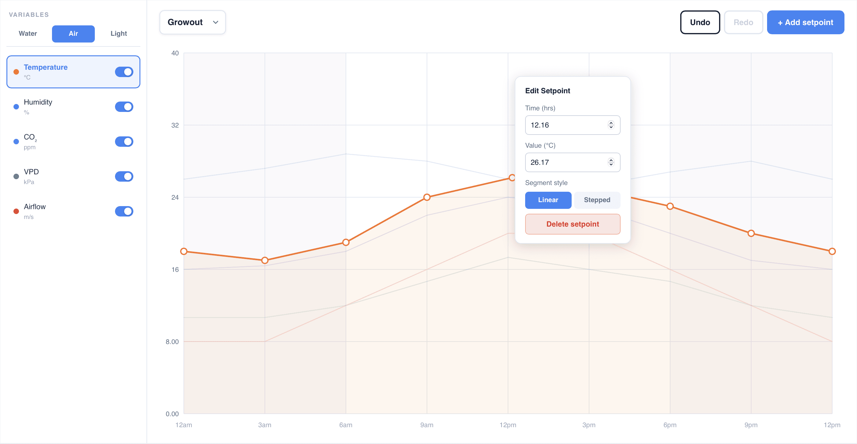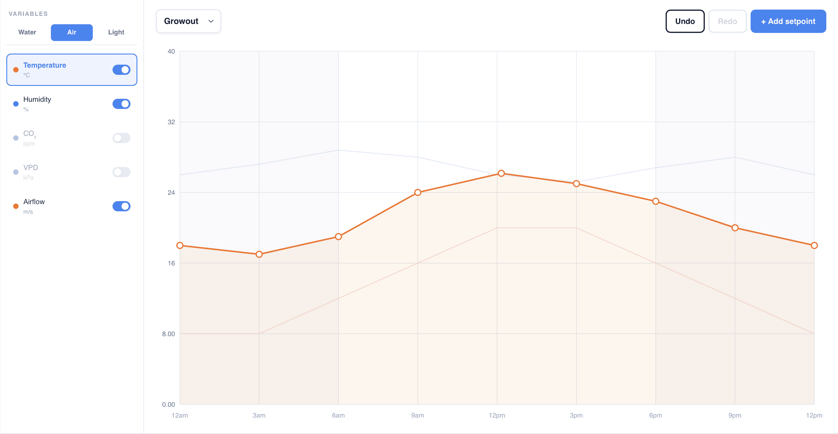 After selecting a stage, users can manage the variables within a cycle, all graphed visually through lines on a chart. When a variable is selected, all of its inflection points can be manipulated and the Y axis will update to the related units. Small visual changes make it easy to know which variable is being selected.