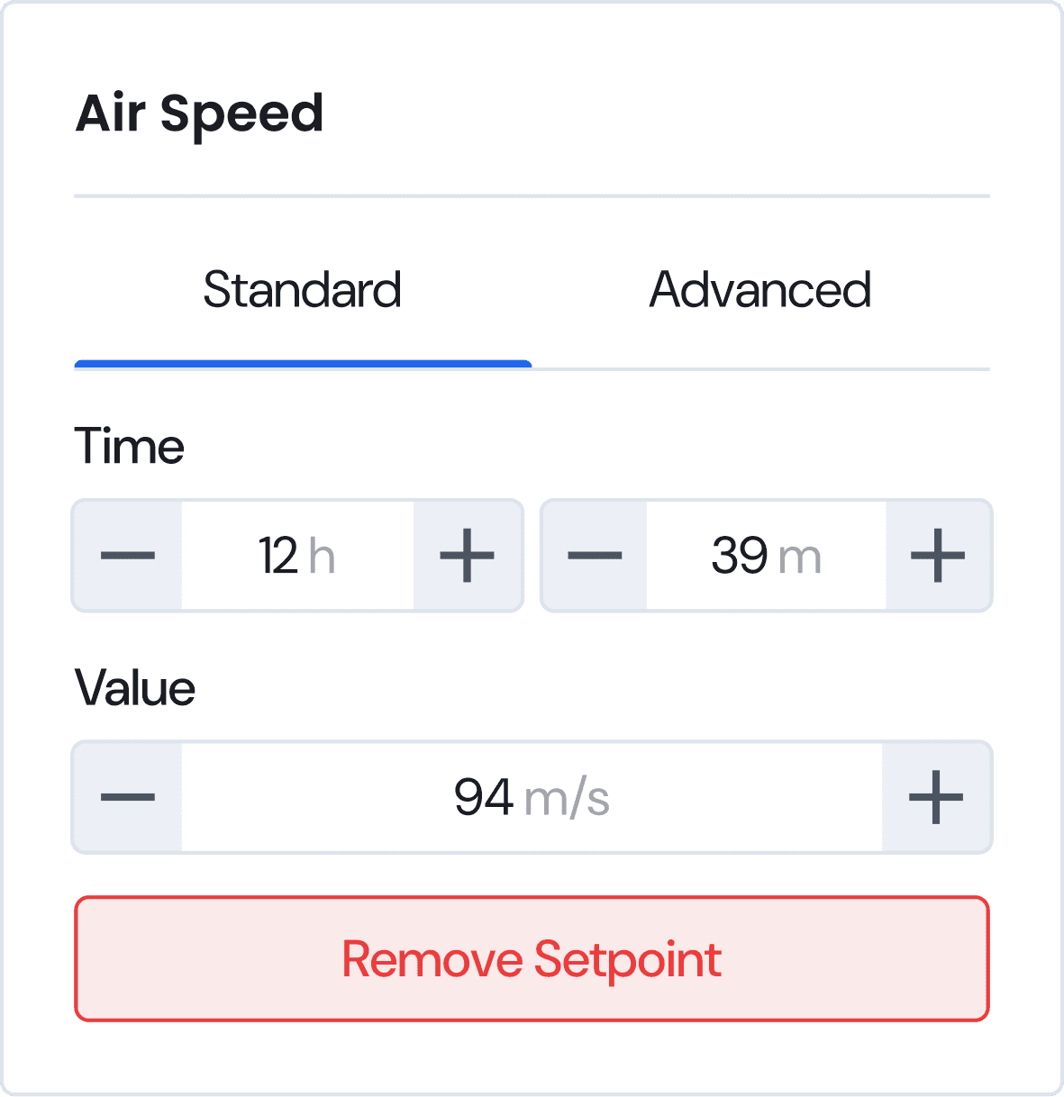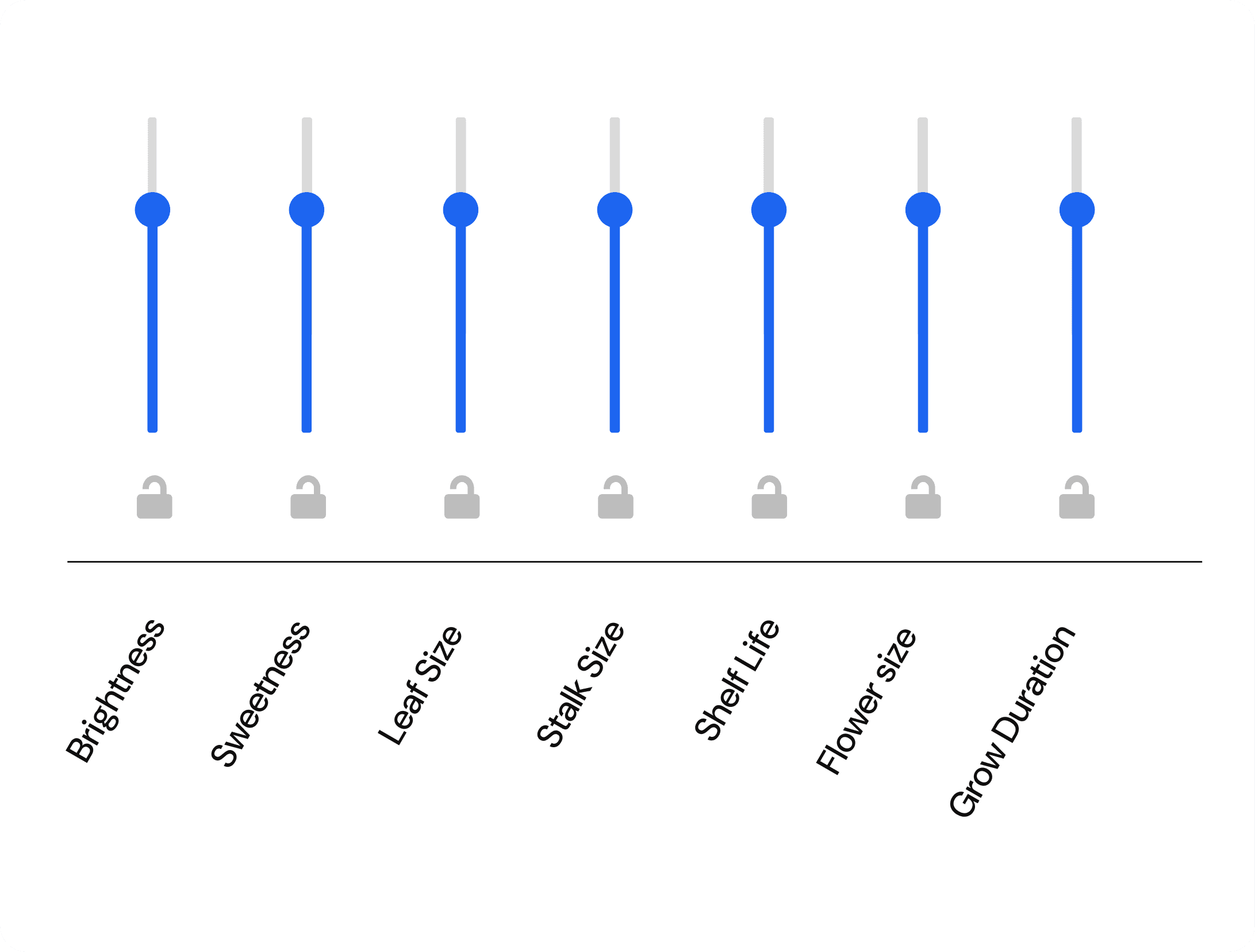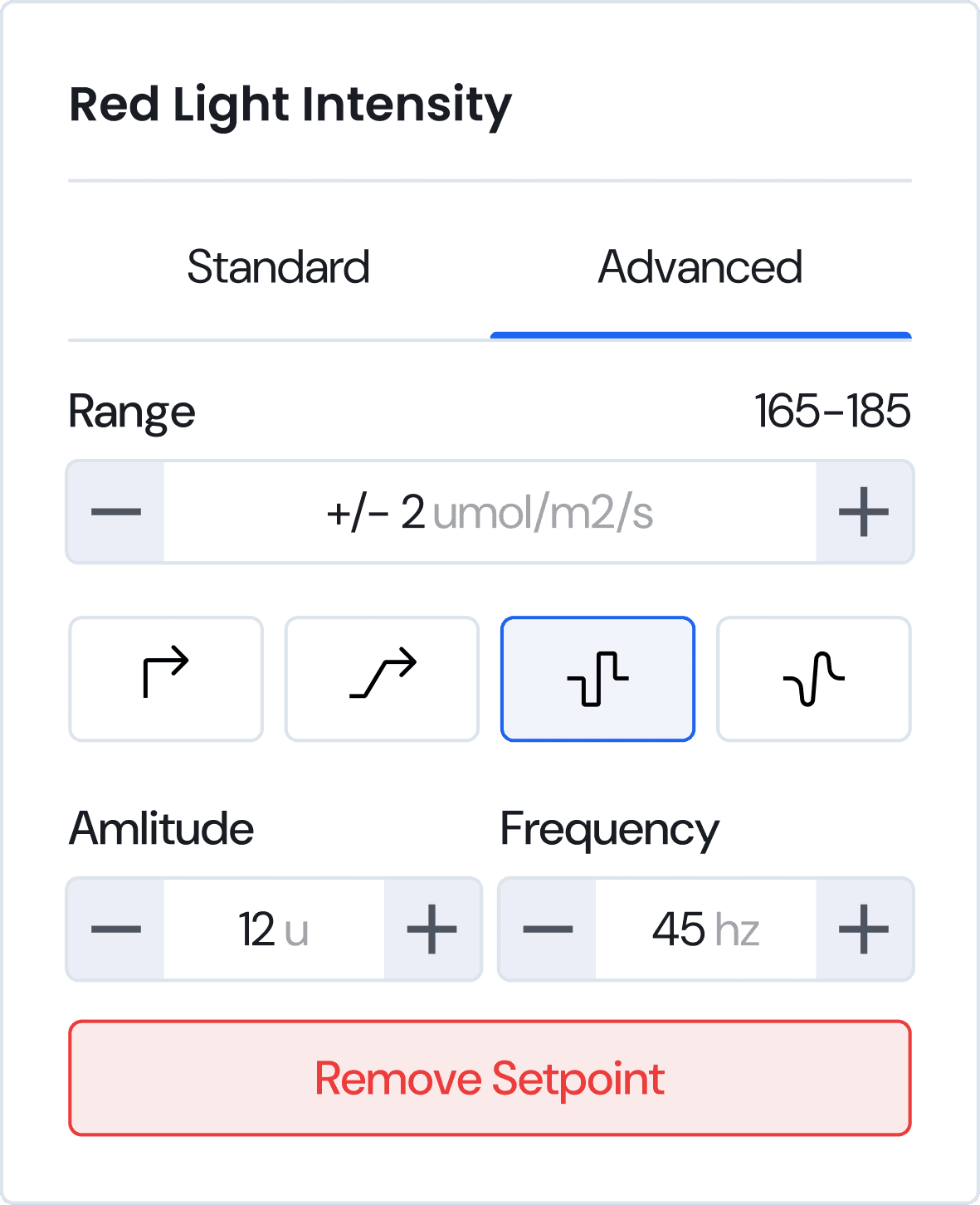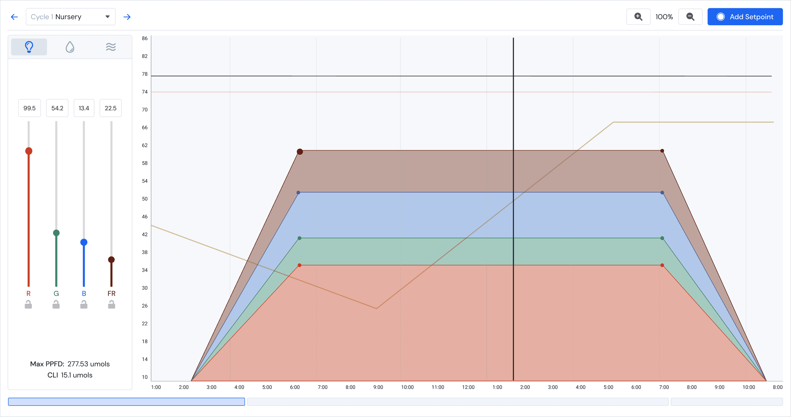 Lighting setpoints are more complex and controlled by sliders. The ratios are connected so increasing one light spectrum will have an inverse effect on all of the others.