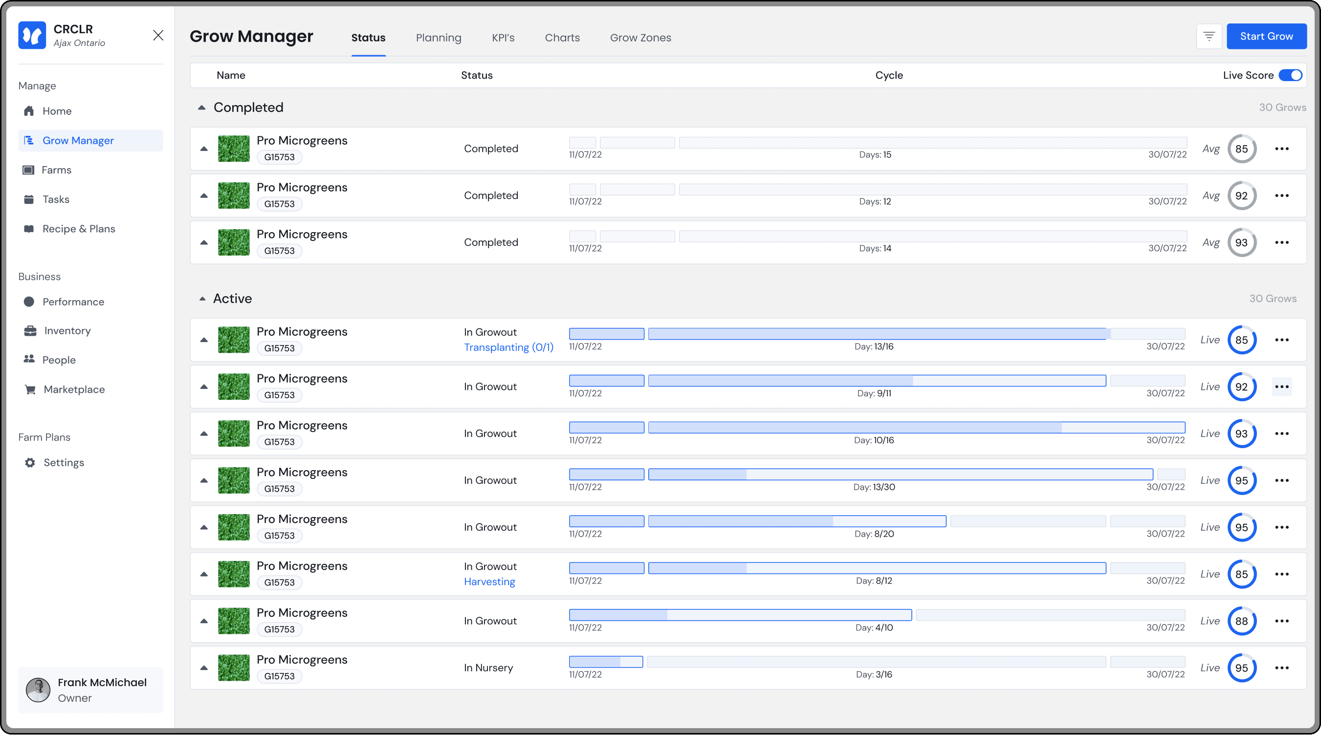 The CRCLR system is a series of movable racks, a nutrient distribution system and a software that allows users to manage indoor farms. These farms operate year round controlling all possible environmental variables such as temperature, nutrients, humidity, light levels & more.