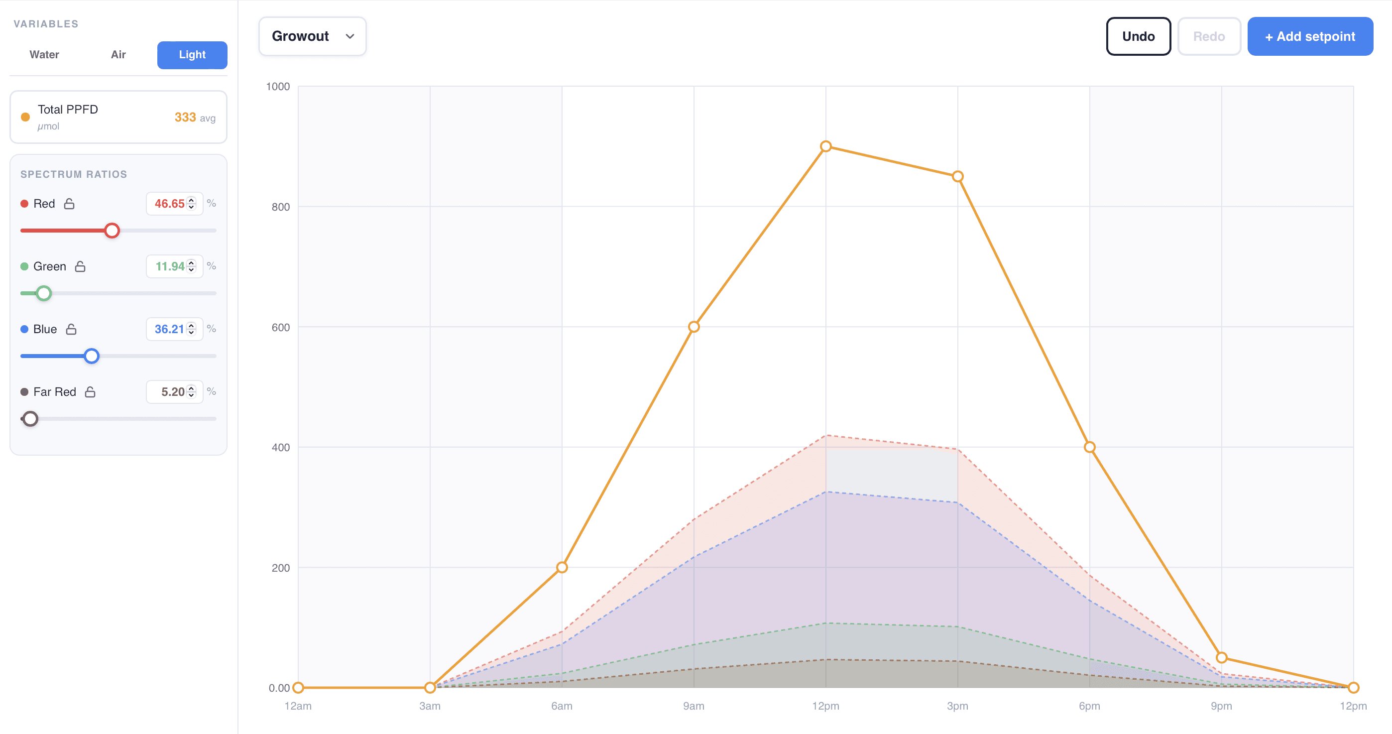 Lighting setpoints are more complex and controlled by sliders. The ratios are connected so increasing one light spectrum will have an inverse effect on all of the others. The overall intensity is managed through the master line above.