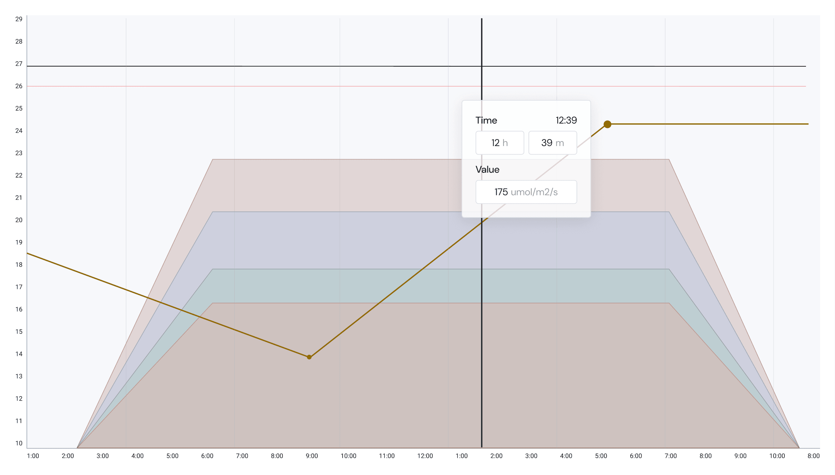 The preferred design included graphing the data over a repeating time frame. These cycles of either 12 or 24 hour periods let users create a day & night mode that ramps down quickly and easily.