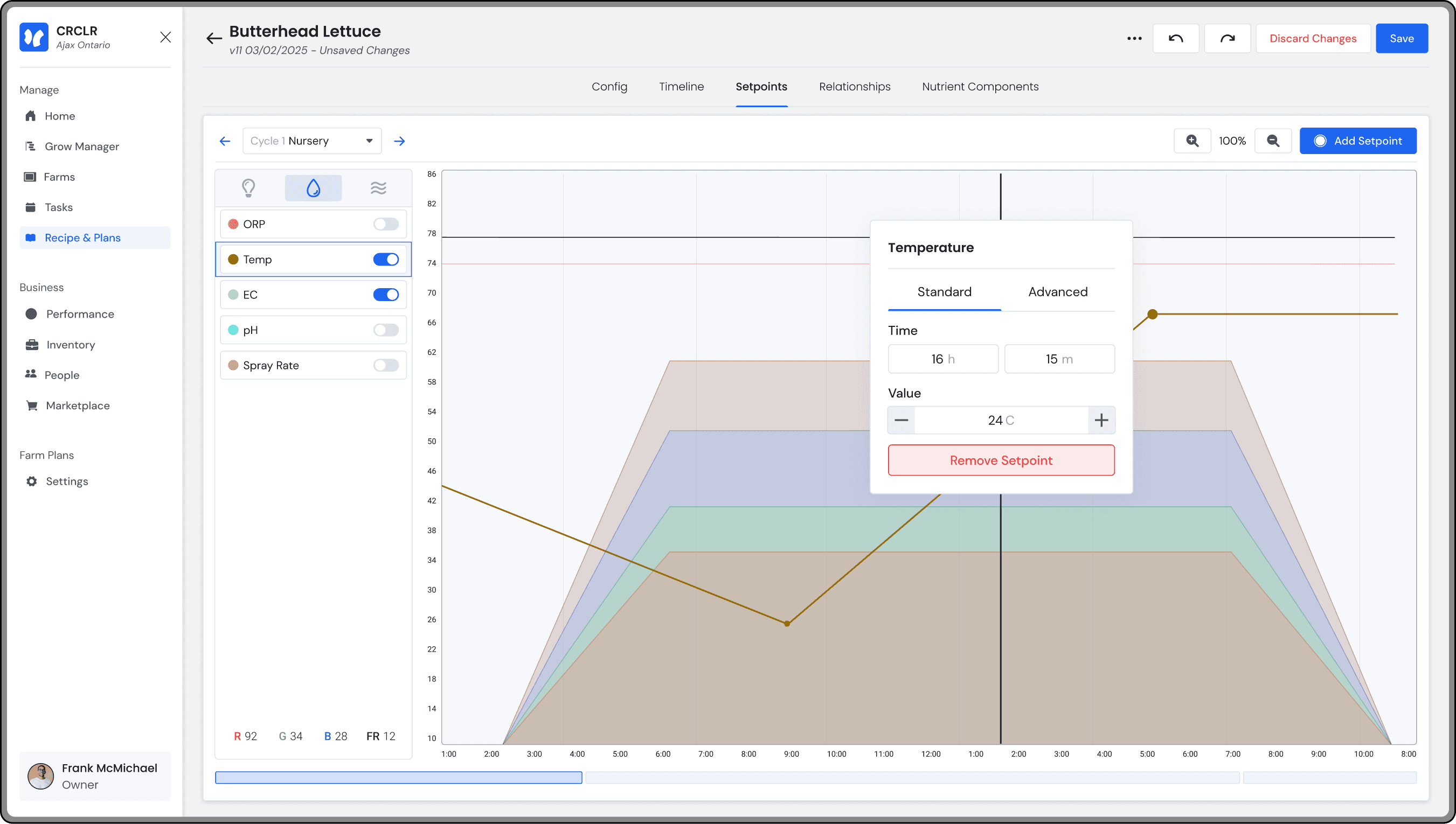 Within the setpoints tab, users can manage the variables within a cycle, all graphed visually through lines on a chart. Each lines can be manipulated to increase or decrease over time