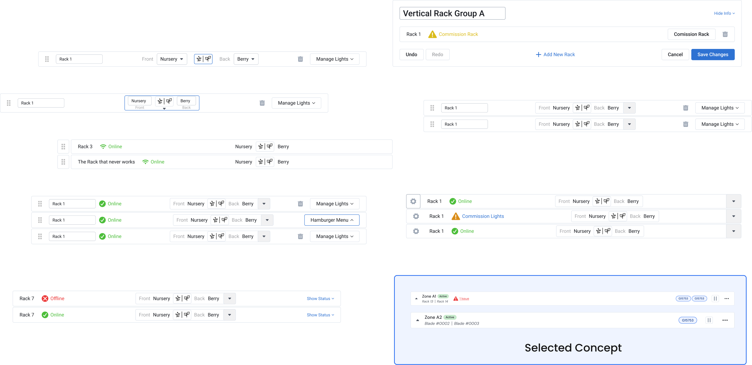 Based on discussions with farmers using our sytem, we built a list to group the ideal hierarchy of what they would look for when viewing this page. The groups are split between high priority items to be seen at a glance and more complex items that could be accessed through secondary actions.